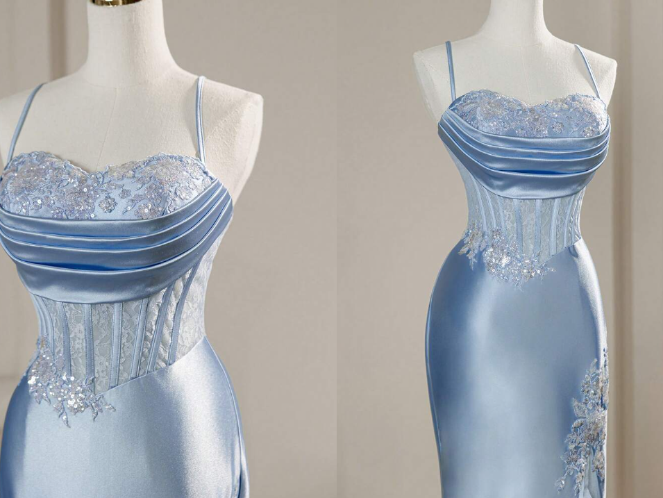 Elegant Mermaid Spaghetti Straps Blue Satin Beaded Pleated Long Prom Dresses Vestidos De Dia HZ0311